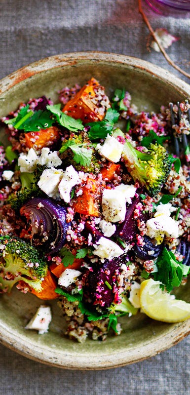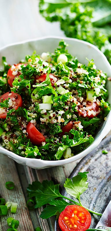 For a really simple side dish, drizzle ½ cup cooked quinoa with ½ teaspoon each of lemon juice and olive oil. Season with salt and pepper.