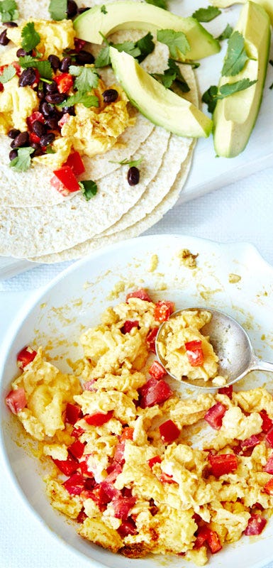 Add egg mixture and reduce heat to medium – this gives you more control and helps avoid overcooking the egg. Stand without stirring, for 30 seconds. Push a spatula from the edge of pan to the centre to create large curds. Repeat until three-quarters of egg is set. Remove pan from heat before eggs are totally cooked and divide between 2 plates.