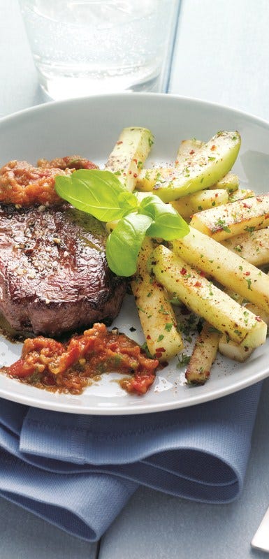 "Un bon filet de bœuf, c'est toujours la certitude d'un repas festif réussi. Pour les frites, vous pouvez éventuellement remplacer le chou rave par des patates douces. Cela vaut un peu plus de points, mais le goût est au moins aussi bon."