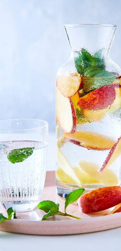 Alle Arten von Wasser (kohlensäurehaltiges, stilles, aus jeder Quelle) sowie andere Getränke und Lebensmittel mit einem hohen Gehalt an Wasser tragen dazu bei, deinen Körper mit ausreichend Flüssigkeit zu versorgen. Probier doch mal, deine Getränke mit tiefgefrorenen oder frischen Früchten anzureichern.
