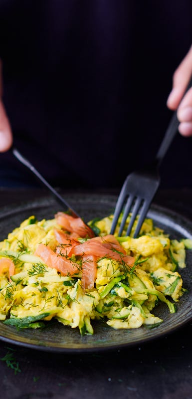 - Frühstück: Zucchinirührei mit Lachs