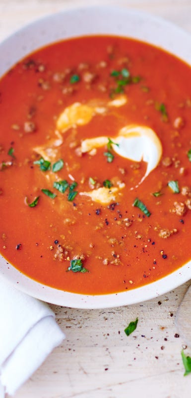 - Mittagessen: Tomatensuppe mit Hackfleisch