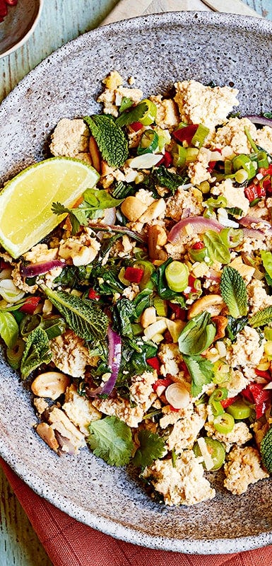 - Scrambled tofu: Replace all or up to half of the eggs with crumbled firm tofu next time you make scrambled eggs. In search of that golden sunny egg colour? Add a generous pinch of turmeric to the scrambled tofu.