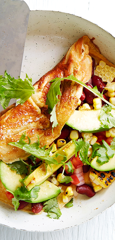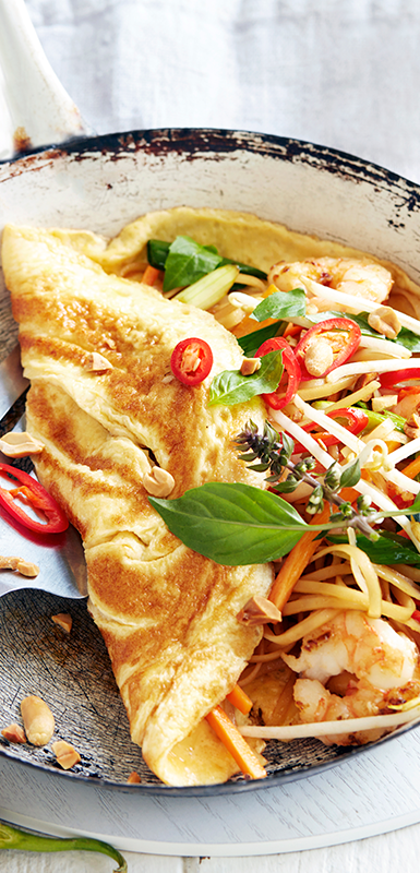 Tip: Use up leftover roasted vegetables or cut up pizza topping ingredients in an omelette. Spinach, mushrooms, olives, ham, artichokes, capsicums and broccoli all work well in omelettes.