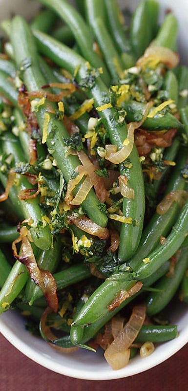 Crisp green beans are sautéed with shallots and then topped with a fresh combination of fresh parsley, lemon zest and minced garlic.